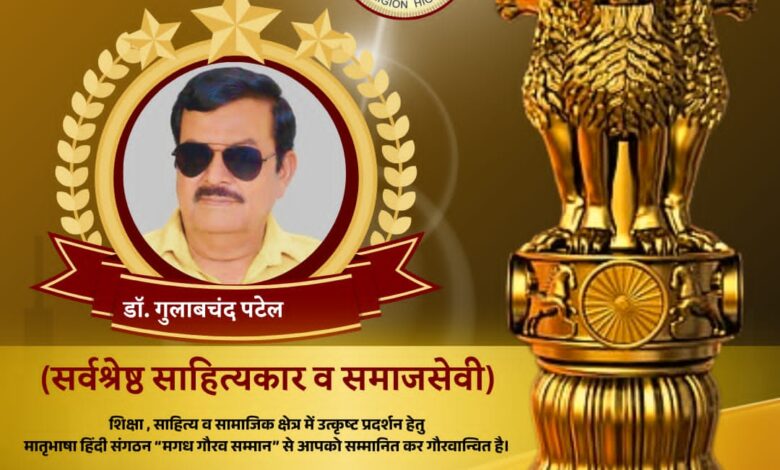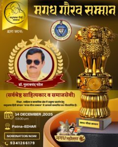 मगध महोत्सव—जो भारतीय संस्कृति, साहित्य, लोक-कला और सामाजिक उत्थान का भव्य उत्सव है—उसमें मातृभाषा हिंदी संगठन द्वारा डॉ. गुलाबचंद पटेल को उनके बहुमूल्य योगदान के लिए “मगध गौरव सम्मान” से सम्मानित किया जाएगा। यह सम्मान उनकी सेवा-यात्रा का गौरवपूर्ण अध्याय सिद्ध होगा।