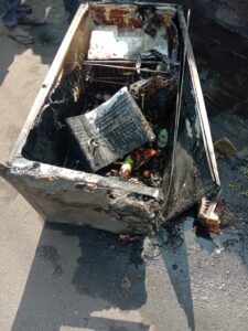 सिंदरी । गौशाला बाजार स्थित पुराने फाड़ी के निकट स्व भगवान साव के घर में शुक्रवार की सुबह 11 बजे शार्ट सर्किट के कारण फ्रिज में आग लग गई। देखते ही देखते आग ने बिस्तर सहित एक रुम को अपने चपेट में ले लिया। आस पास के लोगों ने पानी डालकर आग बुझाया। आग लगने की सूचना पर फायर ब्रिगेड की गाडी पहुँची। परंतु तब तक स्थानीय लोगों द्वारा आग पर काबू पाया जा चुका था। घरवालों के अनुसार इस अगलगी में घर में रखे फ्रीज, मोबाइल, घरेलू सामान, कपड़े सहित लगभग 40 हजार रूपये का सामान जलकर राख हो गया है।